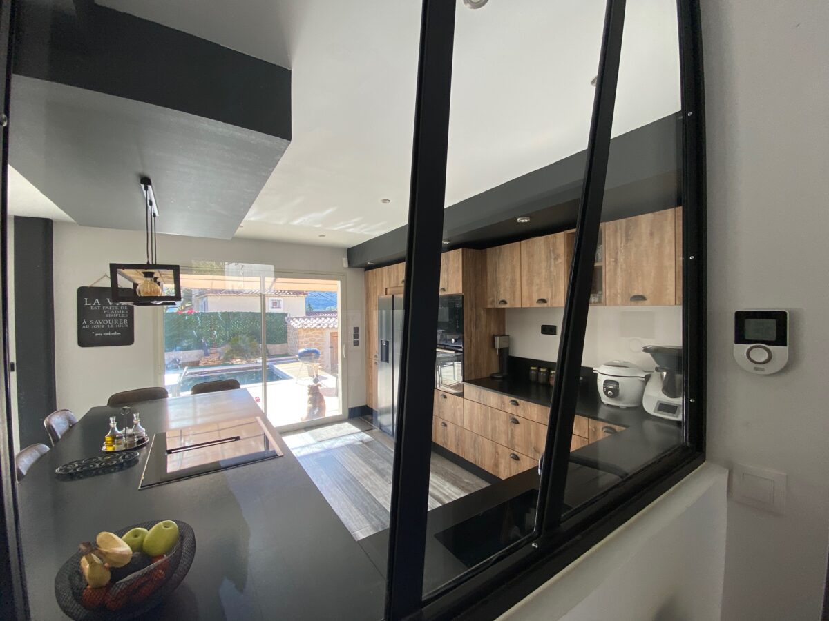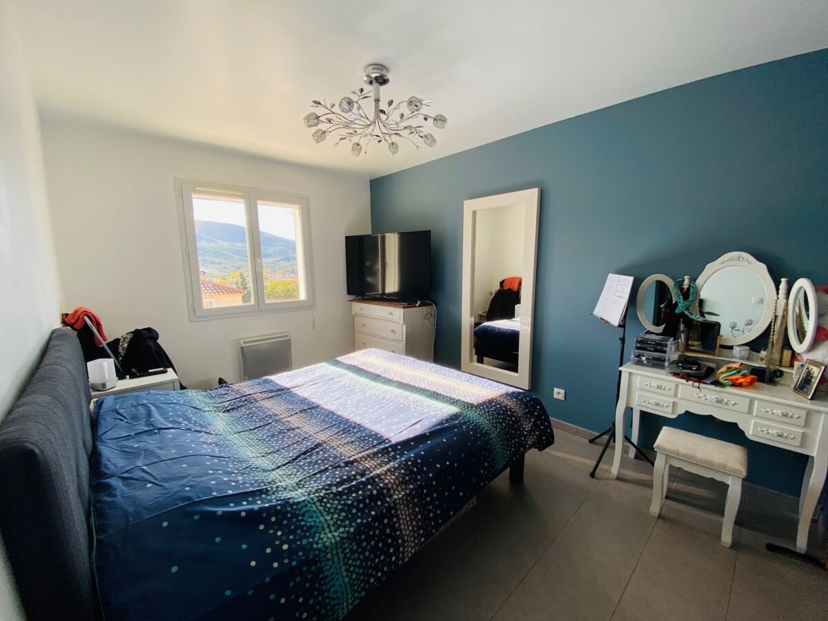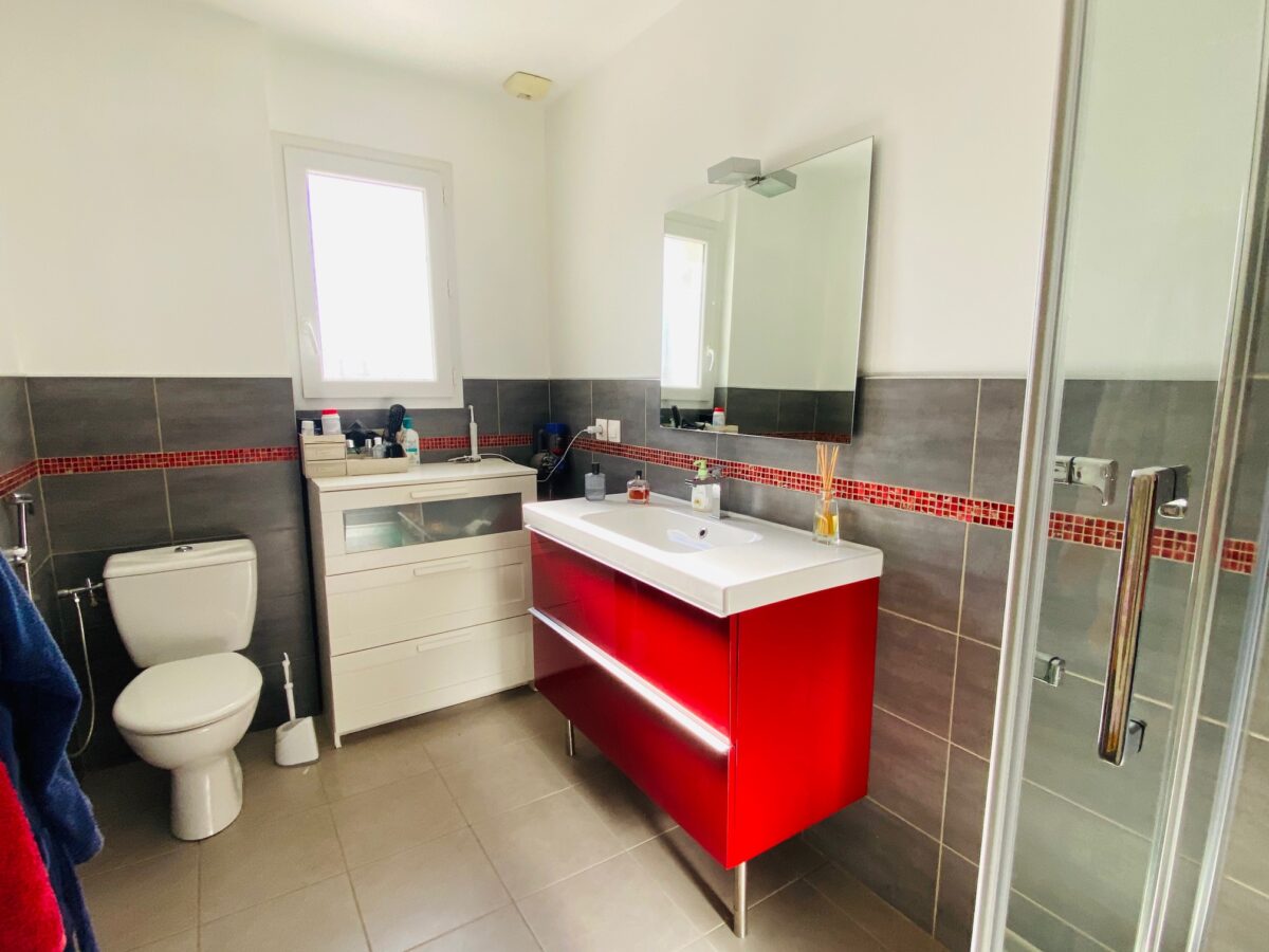 A l’étage, 3 chambres dont une suite parentale avec dressing et sde, sde avec wc. Belles Prestations : climatisation, chauffe eau solaire, panneaux solaires, visiophone, terrasse sud avec pergola, volet solaire pour la piscine…Honoraires agence inclus charge vendeur.