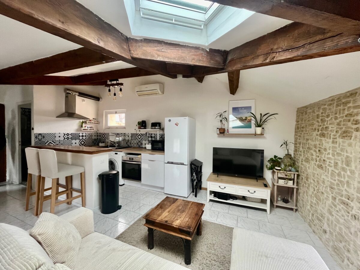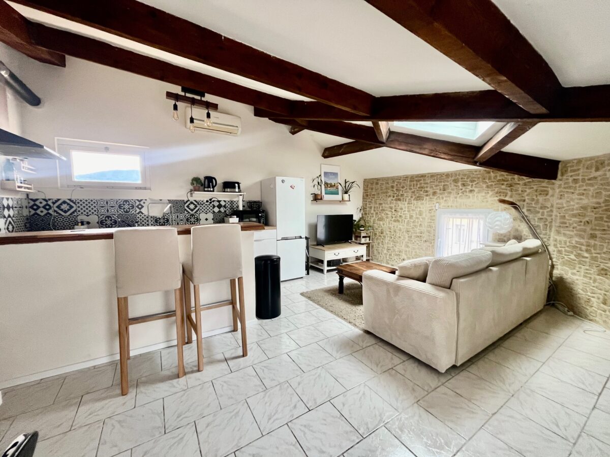 Beau Type 2 meublé climatisé de 36.12m² hab, décorée avec goût au 3e et dernier étage: hall d’entrée, salon avec cuisine us équipée, une chambre placard, sde avec wc.